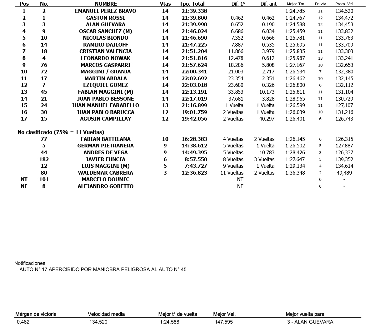 La lucha por la punta de la competencia se planteaba entre Pérez Bravo y Rossi, más atrás Sánchez observaba la situación y, atrás del Chaqueño, Pietranera, Biondo, Dailoff, Valencia, Nowak, Gasparri y Guevara luchaban para avanzar. Un despiste y abandono de Funcia generaba la salida del Pace Car, todas las diferencias se volvían a cero y en el relanzamiento, Guevara avanzaba en la fila india para ponerse tercero.