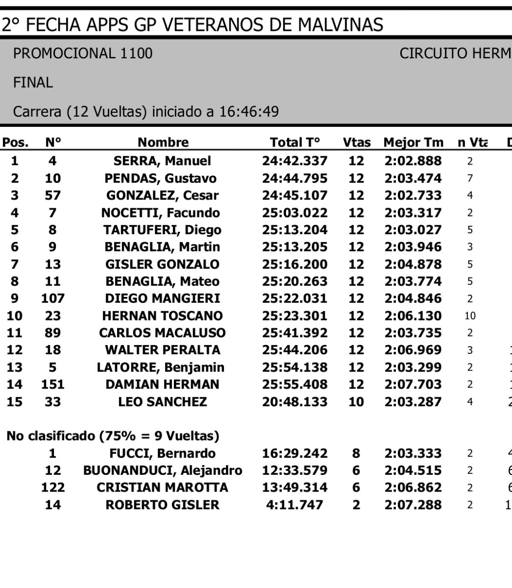 En el segundo lugar quedó Gustavo Pendas pero fue excluido en la técnica por el “avioncito” del carburador, por lo que segundo finalmente terminó César González y tercero culminó Facundo Nocetti.
