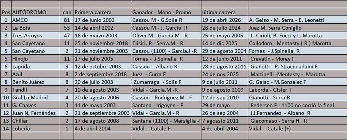 A lo largo de estos 24 años se visitaron 15 circuitos diferentes contando a San Cayetano en su versión de tierra y asfalto.